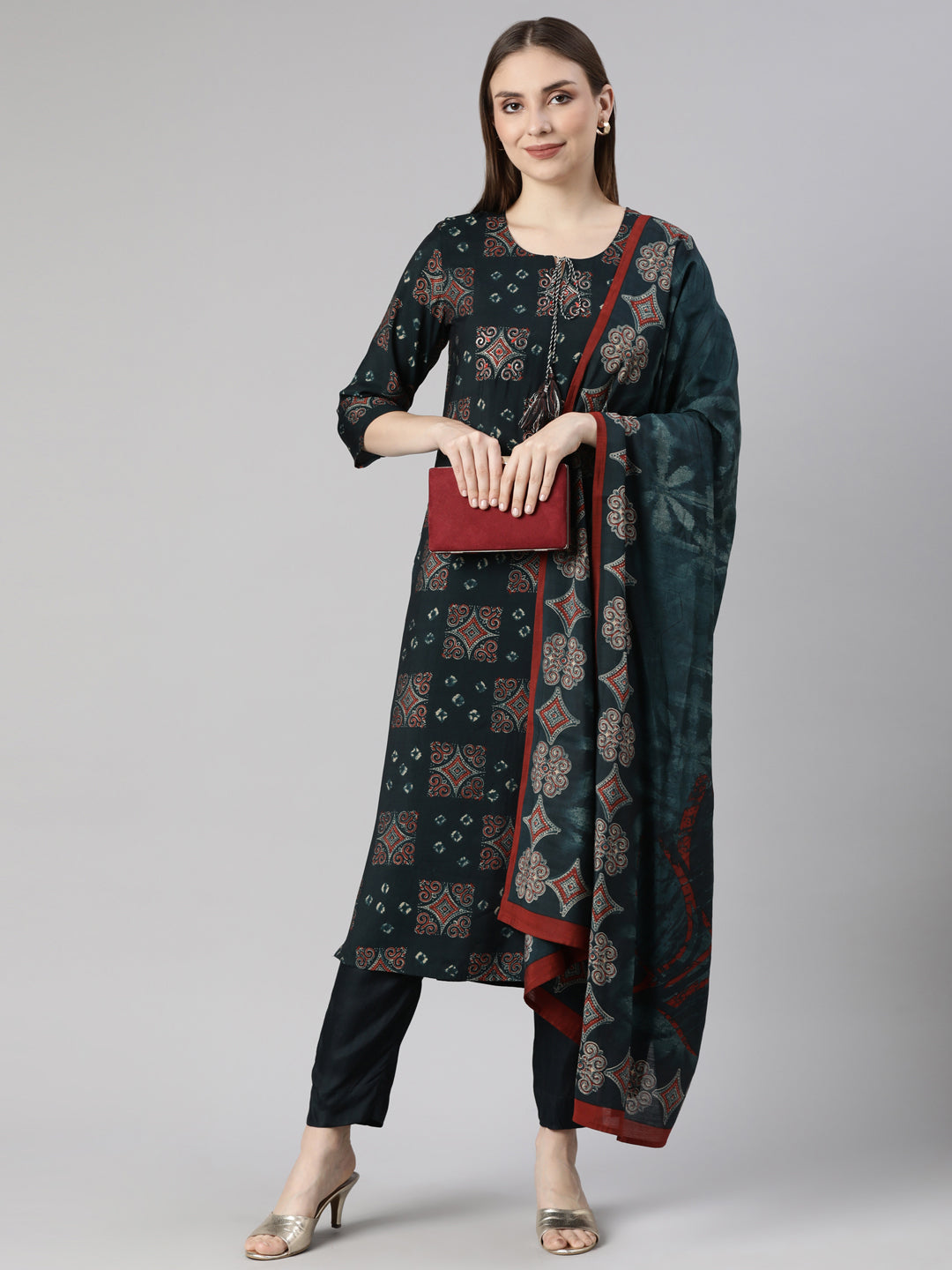 Neerus Blue Regular Straight Geometric Kurta And Trousers With Dupatta