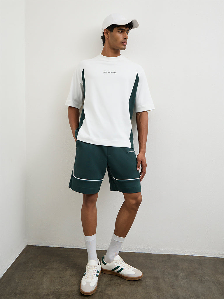 Nuoflexx presents this off-white T-shirt showcasing a minimal text design and bold stripes running along the sides for a sporty finish. A crew neckline and raglan sleeves adds to its laid-back appeal. It is sculpted from a cotton blend fabric in a relaxed fit, ensuring lasting comfort through workouts and active days.