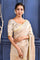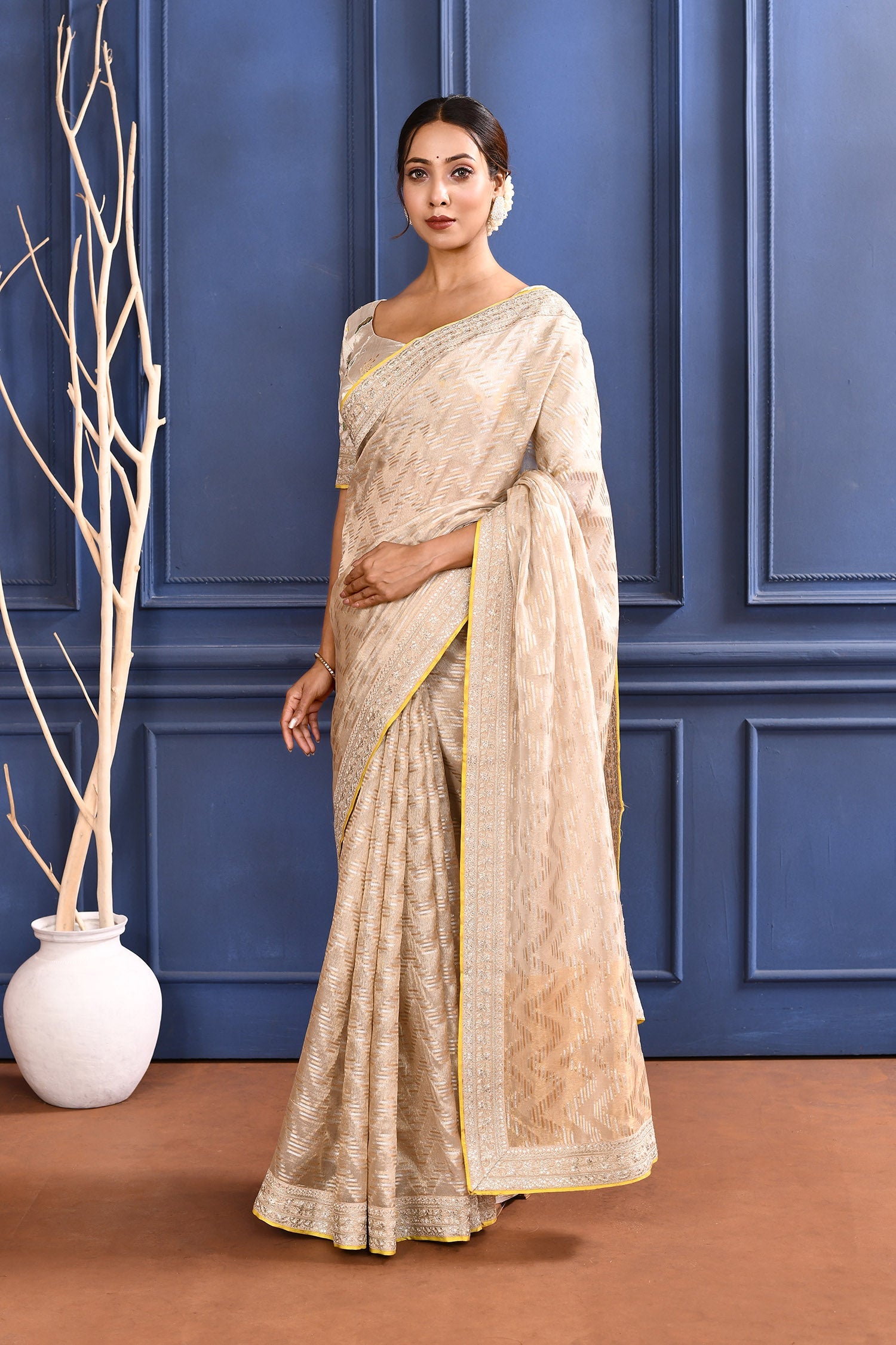 The pastel golden embroidered tissue saree with border highlight and stitched embroidered silver blouse for a stylish look with traditional elegance.