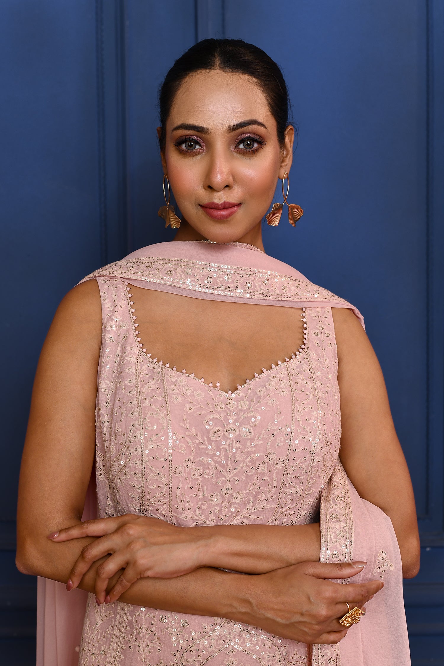 The pastel soft pink embroidered georgette kurta and set with matching georgette dupatta for an elegant look with modern style with ethnic touch.