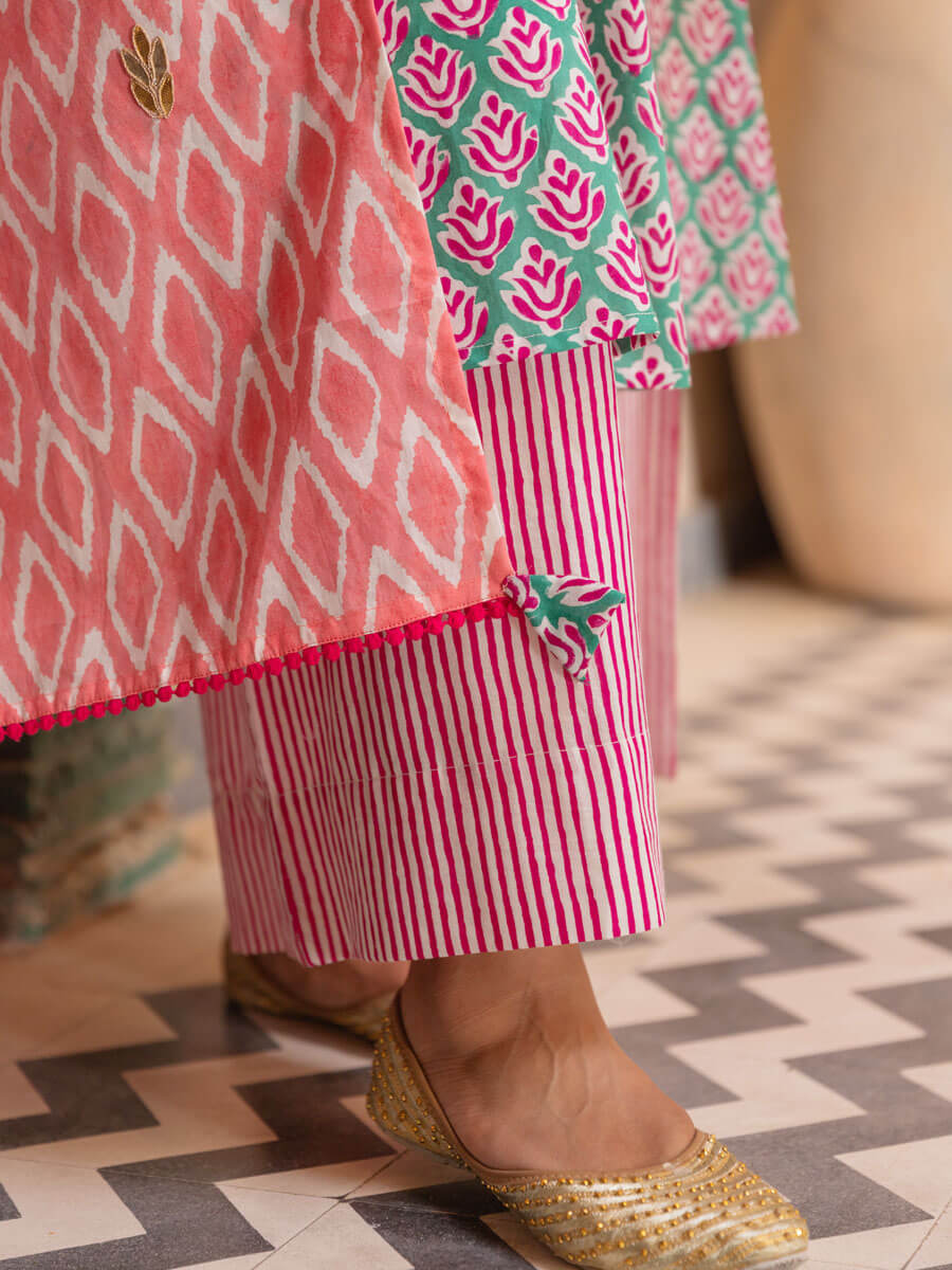 Pink Ikat Hand Block Printed Cotton Dupatta