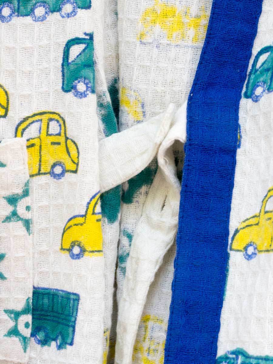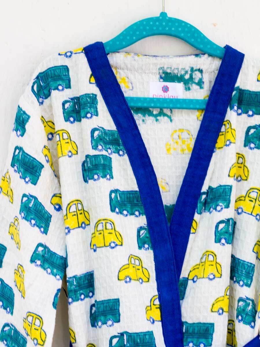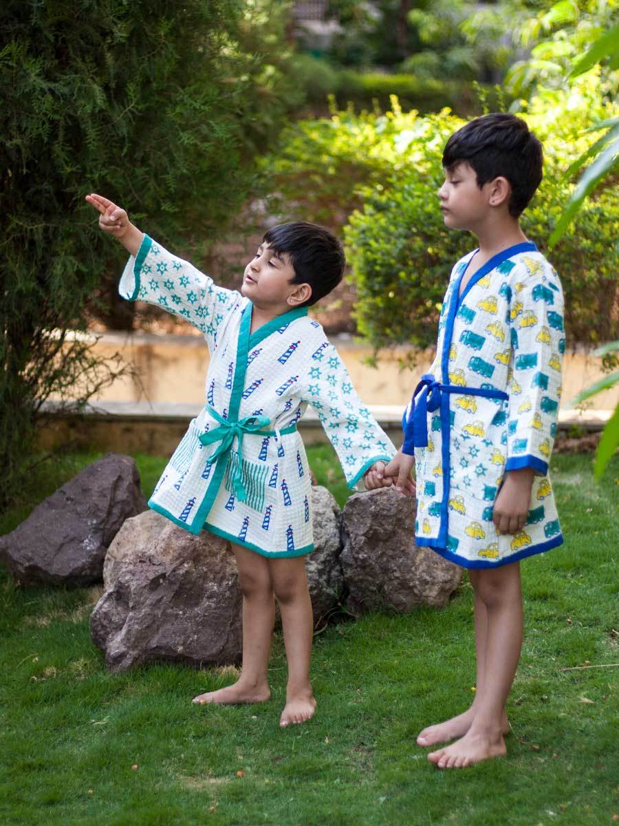 Bathing has never been more fun! Crafted in premium waffle cotton, these hand block print bath robes make for a cute addition in your child's wardrobe. The bath robe comes with an adjustable belt inside for easy fastening.
