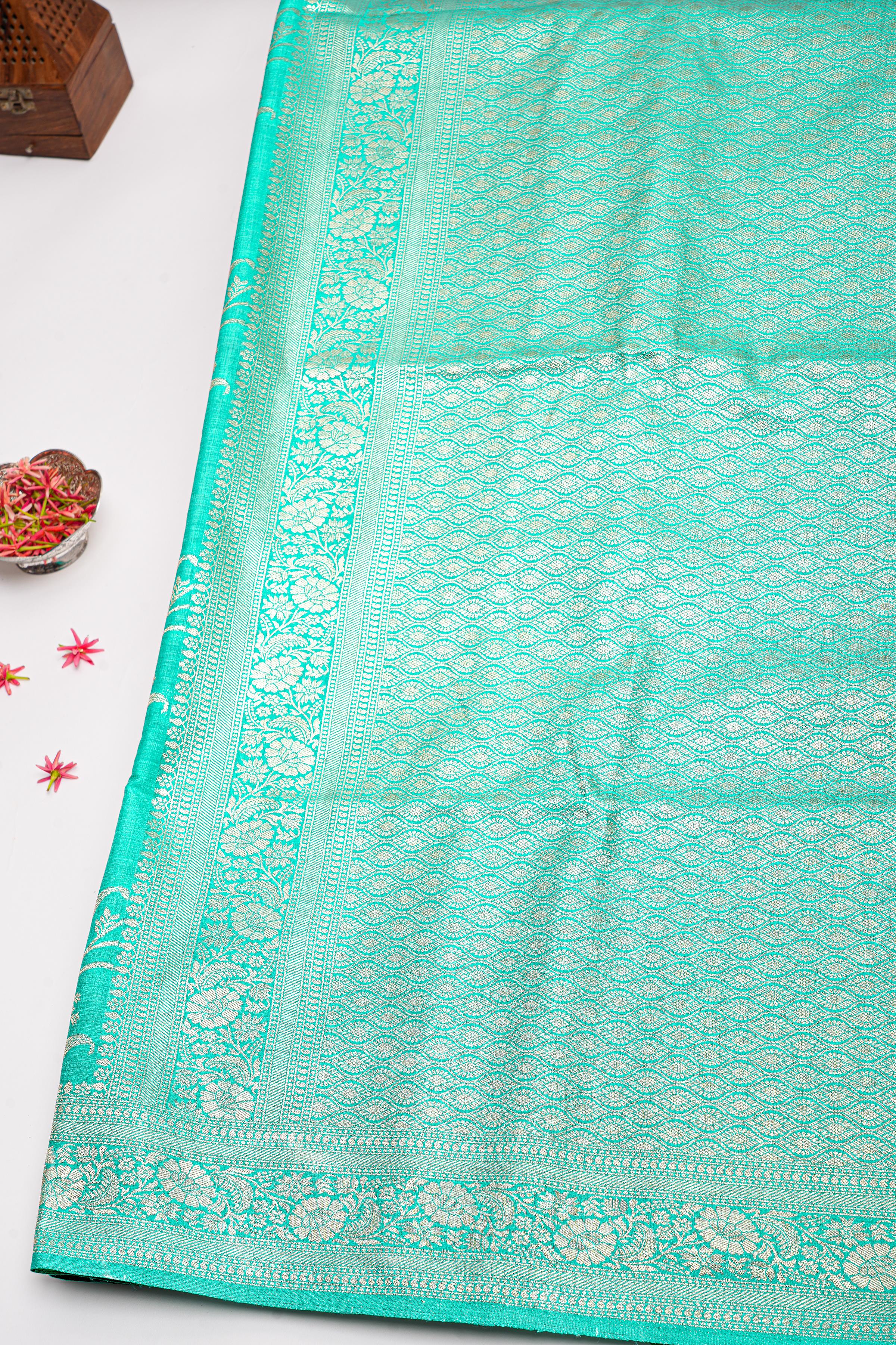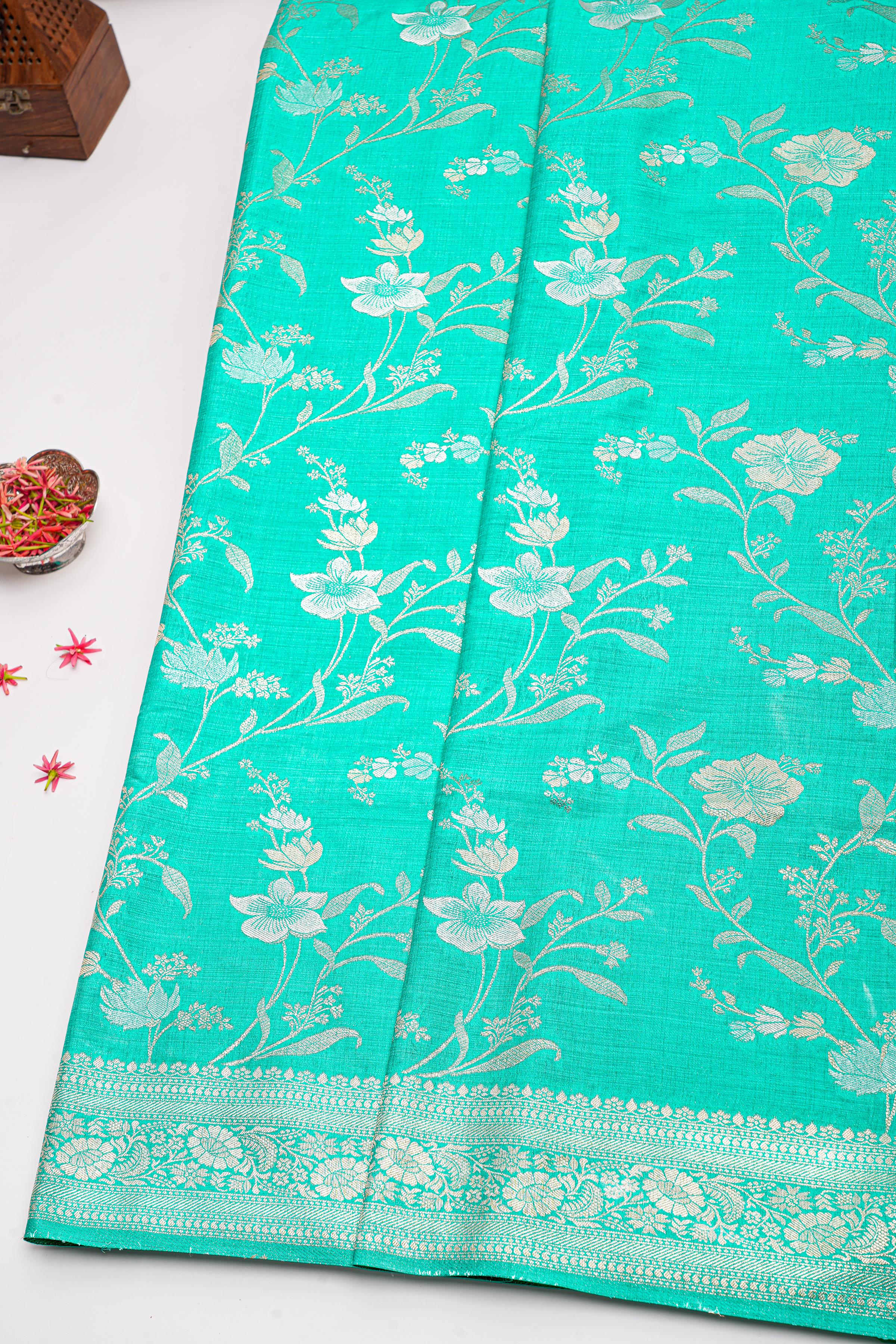 Latest SEA GREEN FLORAL JAAL SILK Saree with ZARI border. This saree comes with PLAIN WITH BORDER SILK blouse.