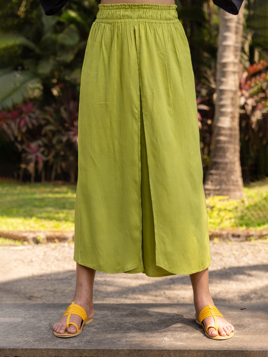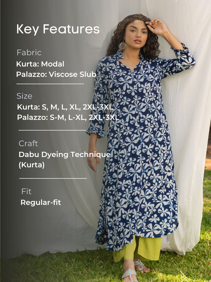 - Elegant A-line indigo shirt kurta paired with wrap-around palazzo pants