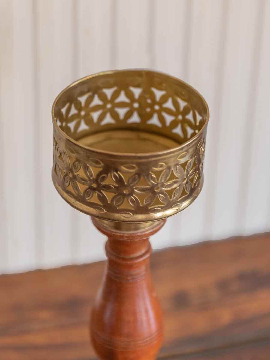 Set of 2 - Jwala Wooden Base Cutwork Metal Candle Stand