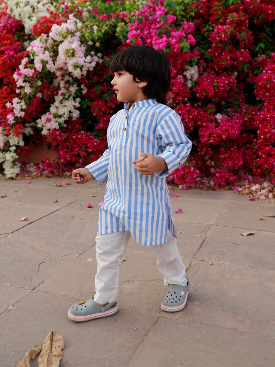 Sky Blue Stripes Organic Cotton Block Printed Long Kurta