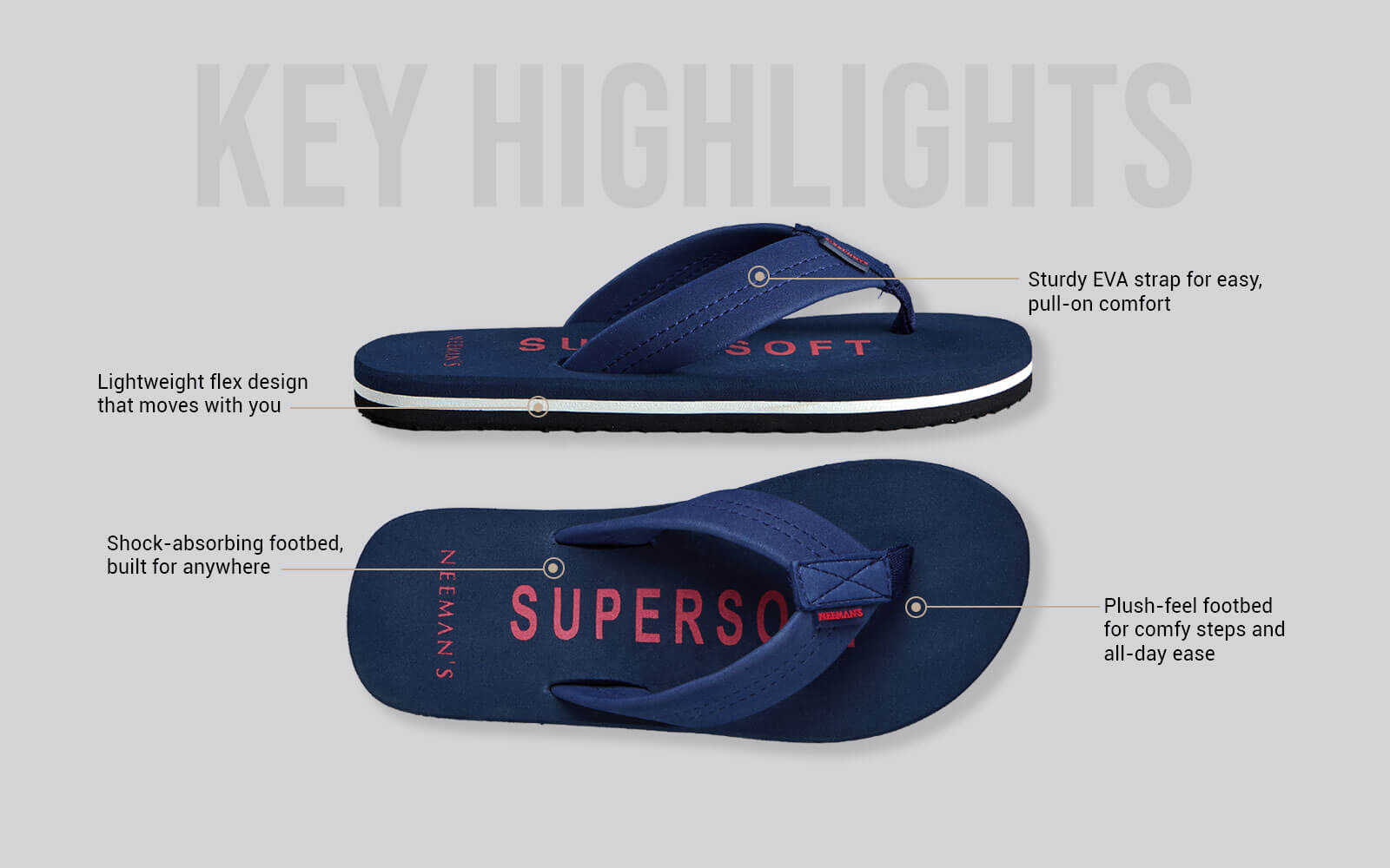 The Super Soft Flips are all about simple style and unbeatable comfort. With a clean, single-color design and just the right pop of detail, they’re easy to wear anywhere. The cushioned EVA footbed and soft straps add orthopedic comfort and make every step feel like a breeze, whether you're running errands or hanging out with friends. It’s comfort and style that moves with you, all day long.