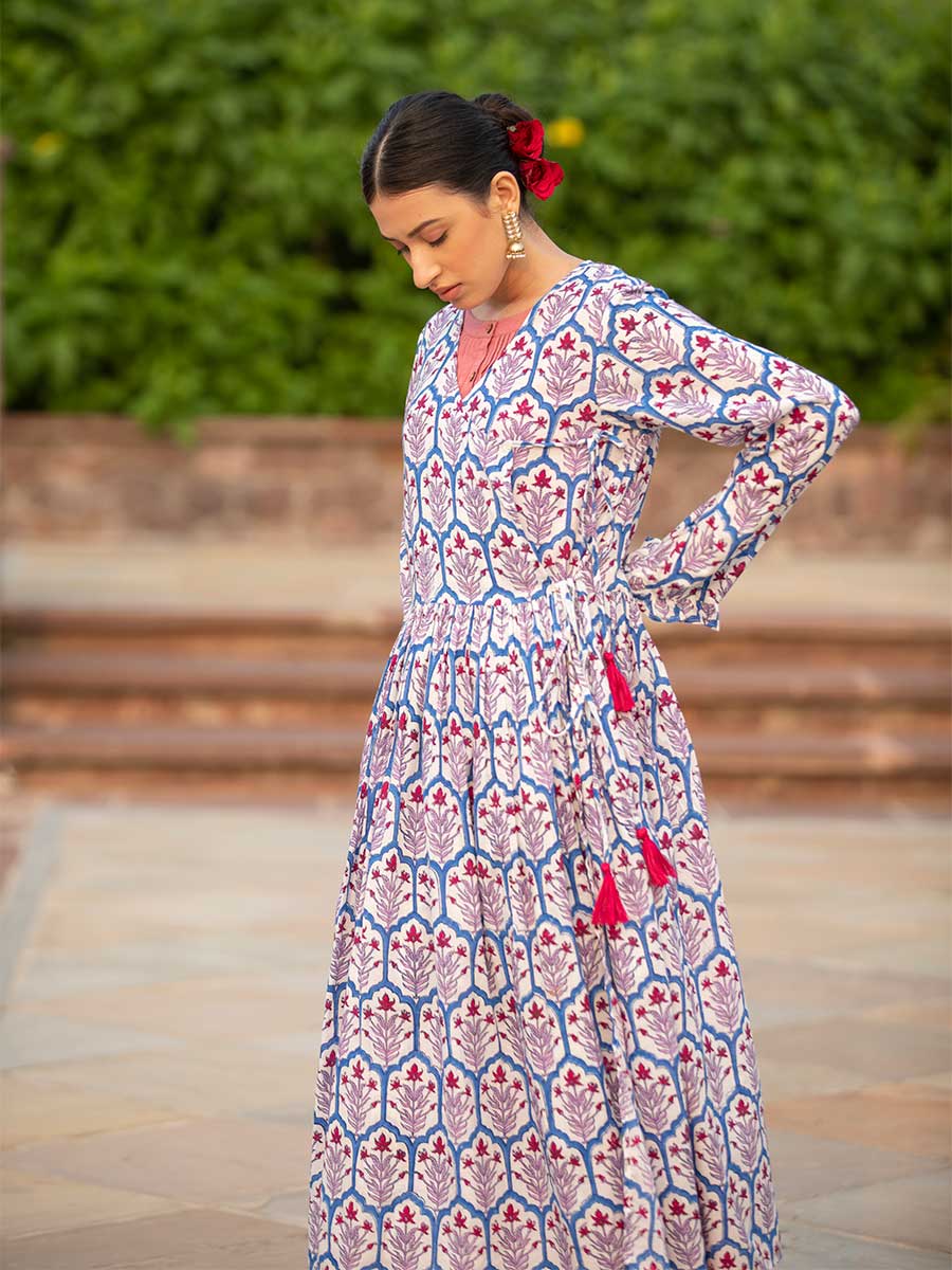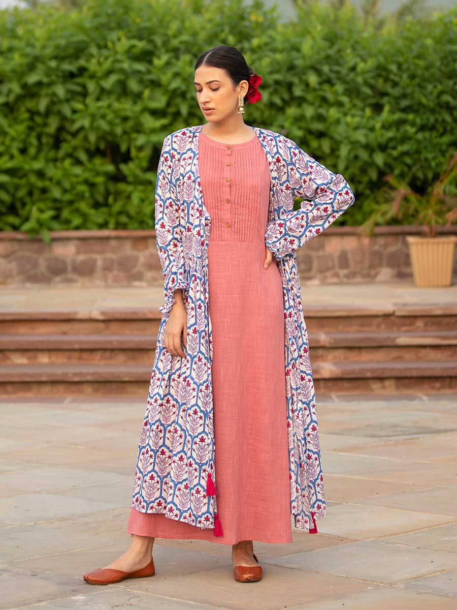 A hand block printed angrakha jacket featuring a dramatic flair. It can be left open or tied using the tassel strings provided on each side. This listing is only for angrakha jacket. Our model is 5'6" and is wearing S.