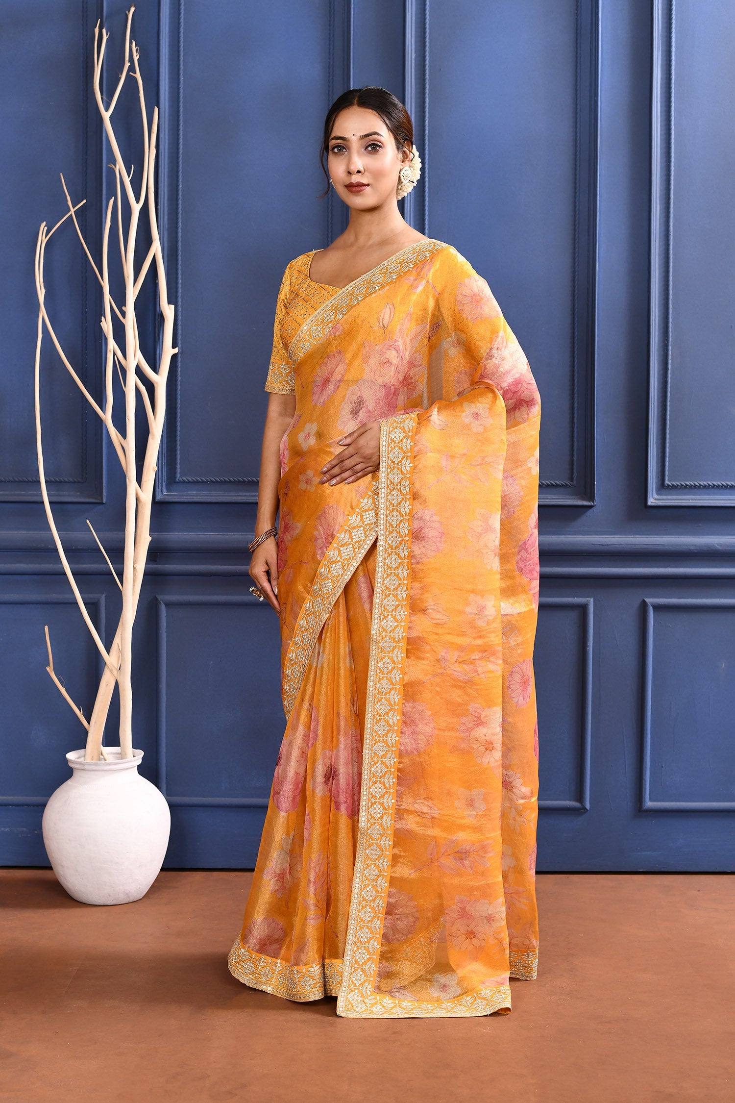 Turmeric Yellow Floral Printed Tissue Saree