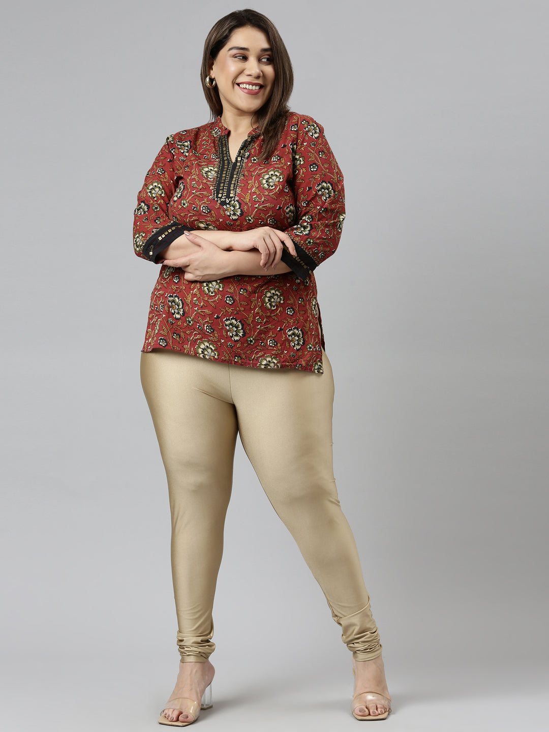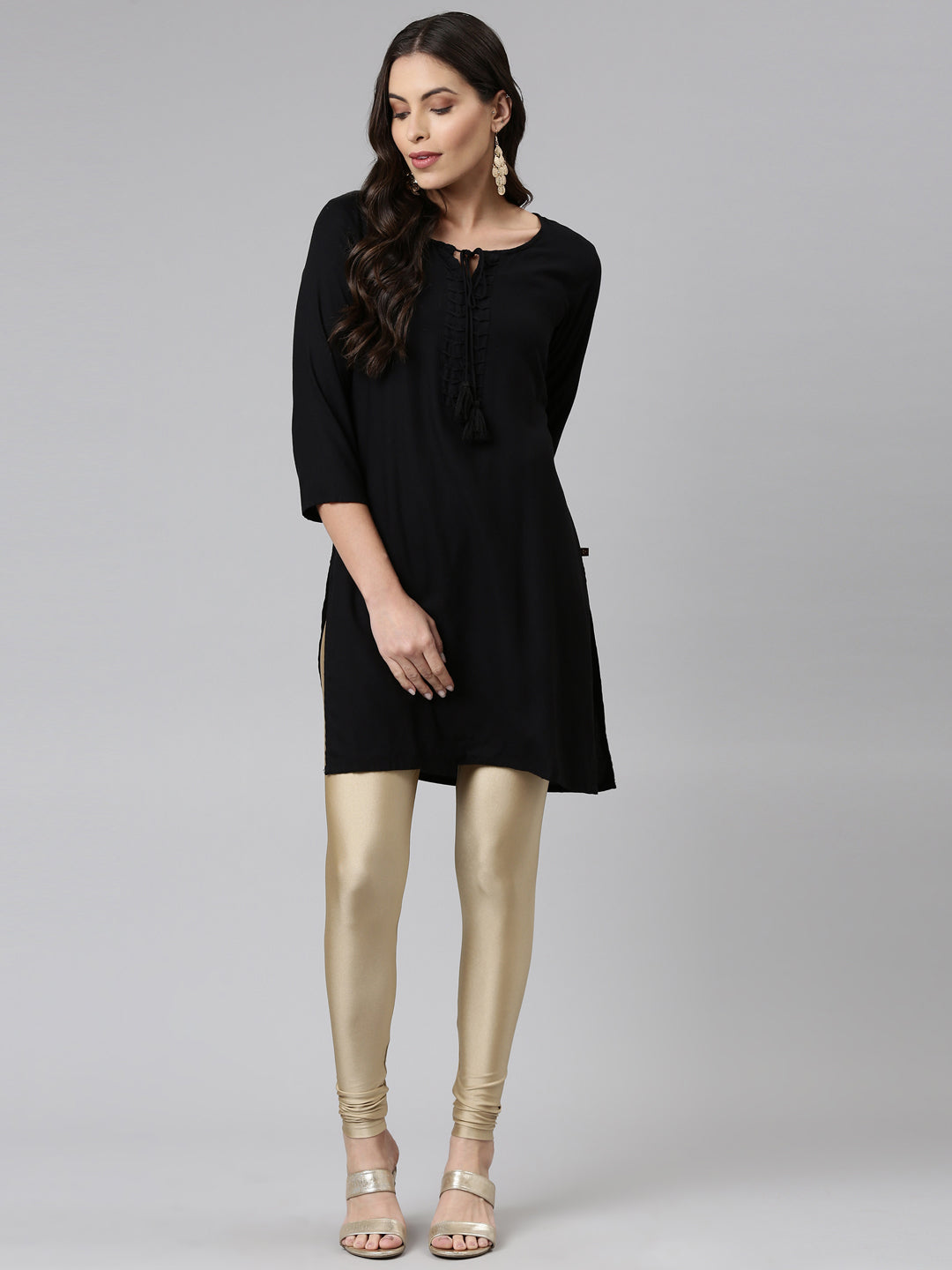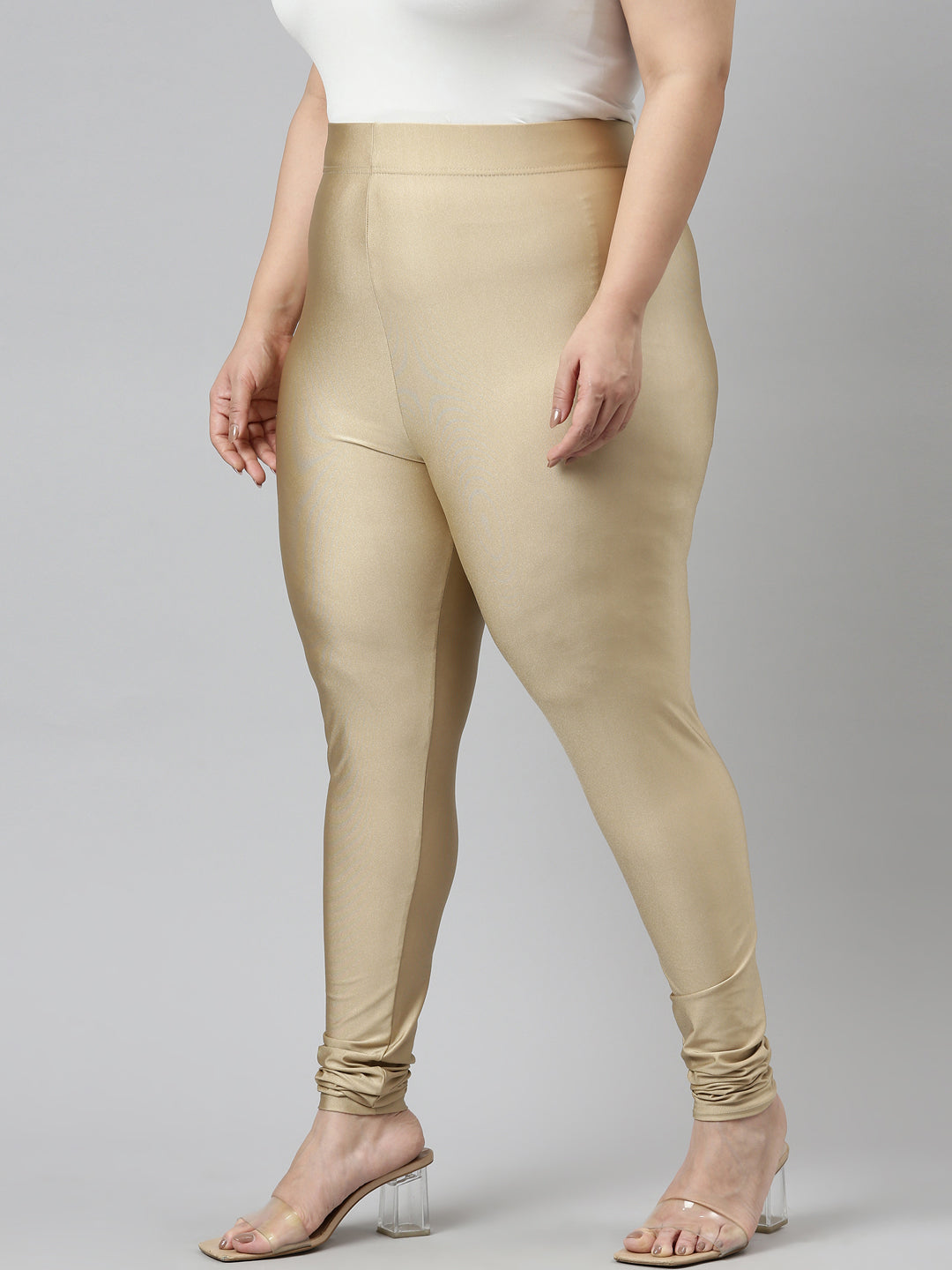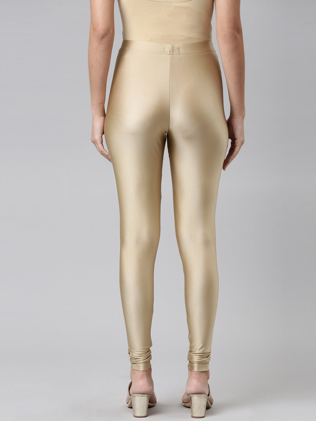 Go chic with a pair of Gold Solid Shimmer Churidar Leggings. Made from high quality Nylon & Elastane, it has a elasticised waistband & gathers at the hemline.